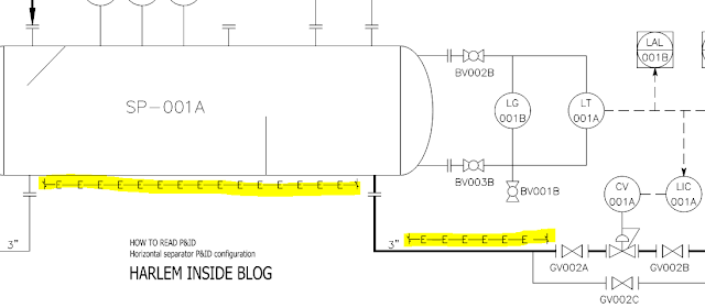 설명 ☞ 그림 4에 보온열선 라인을 예시하였습니다. 표기가 된 구간에 대해서는 실물에 대해서 보온열선을 한다는 것을 의미합니다. 이처럼 INSULATION, PROTECTION 등에 대해서는 P&ID상에 NOTE를 추가해서 사양이나 범위 등을 추가적인 정보로 기재하는 경우가 있습니다.