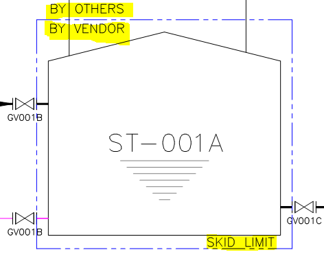 공급범위를 뜻 합니다. 이점쇄선으로 표기된 선을 기준으로 문자가 위치한 곳이 VENDOR(기계,장치 공급업체) SCOPE 입니다. SKID LIMIT은 한계를 의미합니다. 호칭은 아래와 같습니다. LIMIT OF VENDOR PACKAGE LIMIT OF SKID SCOPE OF SUPPLY SCOPE OF VENDOR SCOPE OF OTHER |