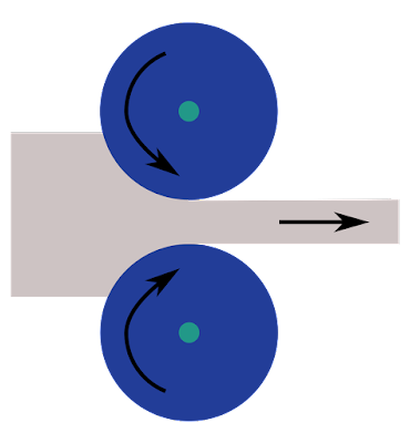 - 압연공정 : 주조 공정을 통해 생성된 소재 (슬래브, 블룸, 빌릿, 잉곳)를 아래 그림과 같이 회전하는 롤 사이를 통과시켜 연속적인 힘을 가압하여 얆게 만들어 가는 과정을 말 합니다. 소재는 Roll 을 통과하면서 마찰 및 압축력을 받게 됩니다.