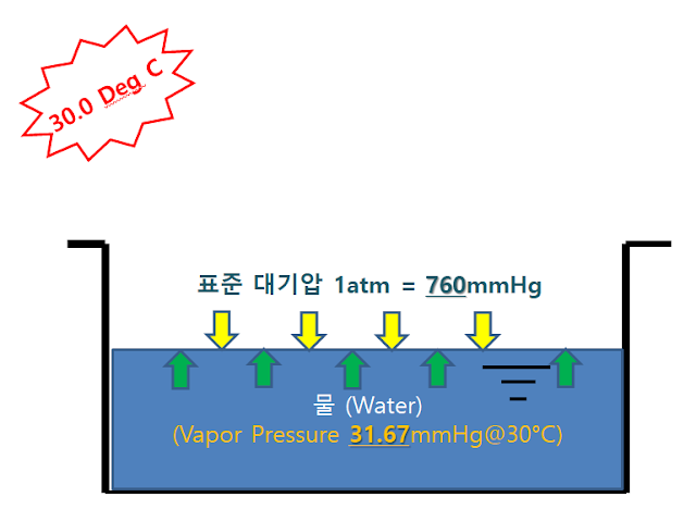 - 물은 30도에서 31.67 mmHg 의 증기압을 가지고 있으며 대기압보다(760 mmHg) 작으므로 열적 평형상태 이하로 내려가 상변화를 일으키지 않습니다.