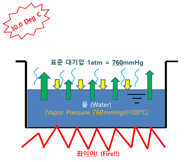 - 물의 온도를 100도 이상으로 가열하자 증기압이 대기압인 760 mmHg 보다 상승하여 열적평형상태가 깨어지고 비점에 도달하여 상변화를 일으키게 됩니다.