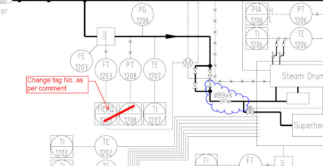그렇다면 왜 Comment 할 때 일반적으로 사용하는 검정색이 아닌 빨강이나 파랑색을 사용하는 것일까요? P&ID나 도면과 같이 검정계열로 출력된 문서의 경우 검정으로 Comment 할 경우 확인이 누락될 경우가 발생할 수 있습니다. 의견이나 반영요청 등 문서상에 편집이 필요한 구간에 대해서 담당 엔지니어가 아닌 제 3자가 보더라도 명시적으로 확인할 수 있게 추가, 변경, 삭제에 대한 내용에 대해 확연히 알 수 있게 Color 을 사용하는 것입니다.