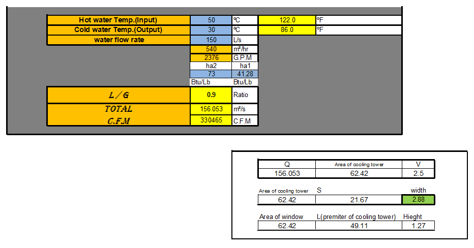 입력값으로 온도조건과 냉각수의 유량 열량 값을 순차적으로 입력하여 냉각탑의 필요 면적을 추정하는데 사용할 수 있습니다.