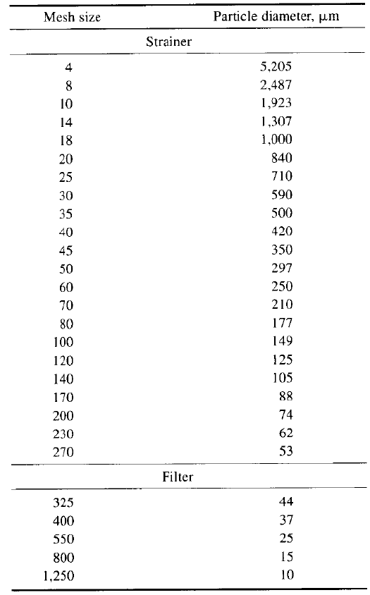 첨부 자료는 Mesh size 와 Filter size 에 따른 이물질 (Particle) 입자의 걸러낼 수 있는 정도를 참고하기 위한 데이터 입니다. 예를 들어 입자의 크기가 719 마이크로 미터 이라면 최소 25 Mesh 이상의 size 를 적용해야 합니다.
