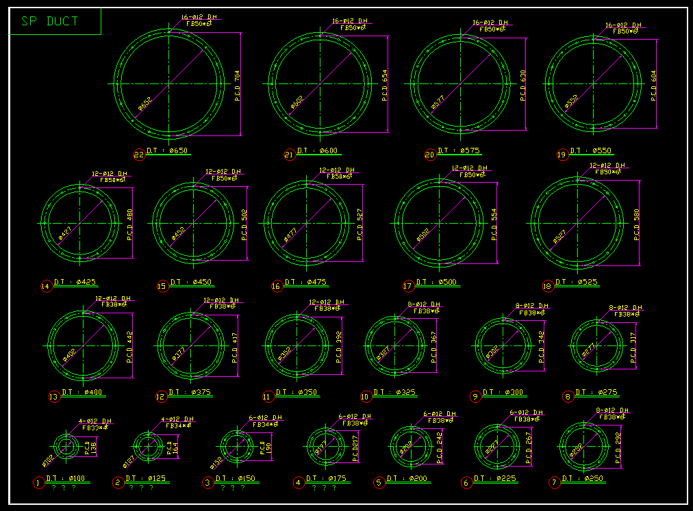 규격은 65 A 부터 1500 까지를 다루며 원형 플랜지와 사각형 플랜지의 Cad block 이 포함되어 있습니다.