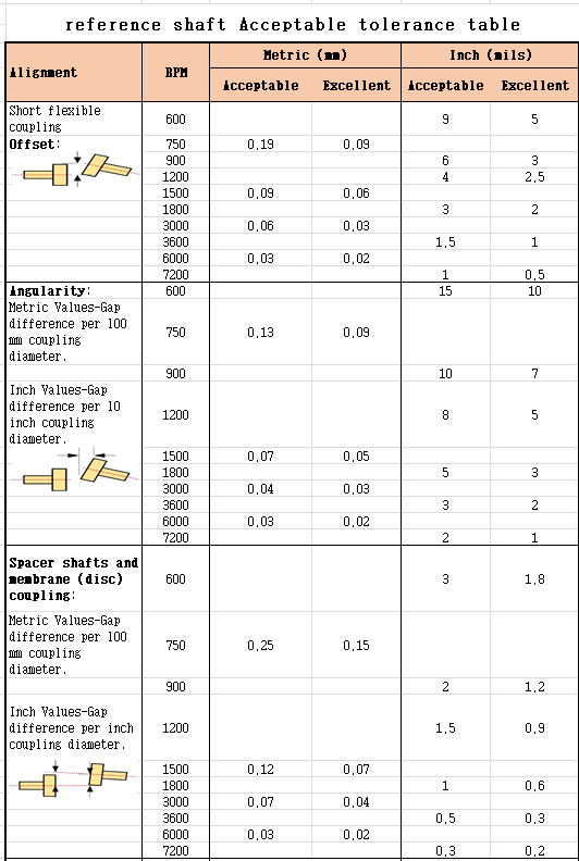 첨부 자료는 샤프트 정렬에 대한 허용 가능한 오차범위 참고용 자료로써 해당 규격이나 제조사의 권고사항이 없는 경우 고려하며 응용하여 사용할 수 있습니다.