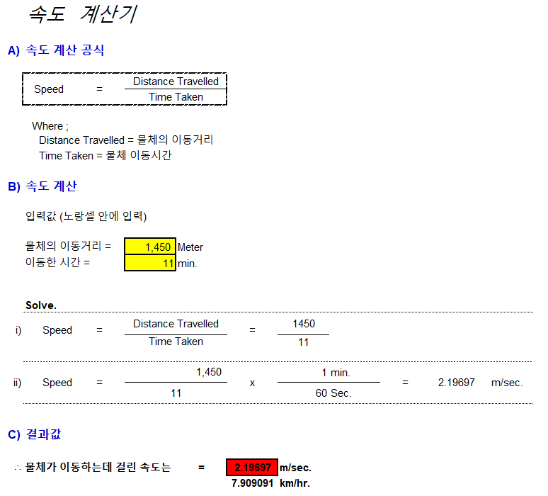 노란색 셀 안에 이동거리와 이동한 시간을 입력하면 결과값으로 물체의 이동 속도를 산출합니다.