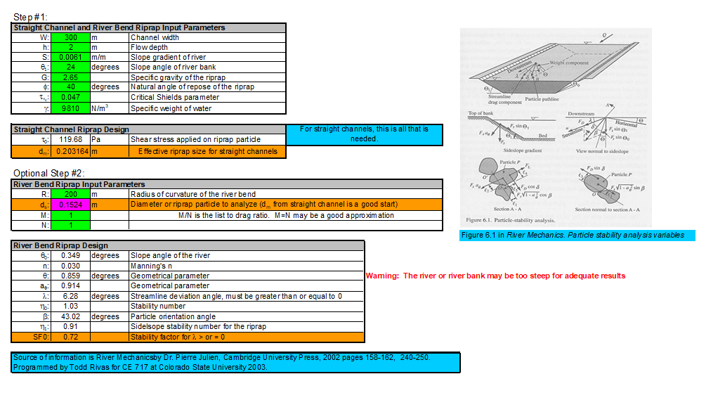 첨부 자료는 수로 Riprap 계산시트 입니다. 전단 응력 접근 방식을 기반으로 수로 둑에 대한 적절한 사석 설계를 지원합니다. 녹색 셀안에 사용자의 설계 값을 입력하면 결과값을 주황색 셀에 반영합니다.