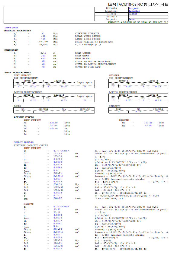 위의 절차는 일반적인 보 설계의 단계를 기술한 것이며 보다 상세한 규정은 ACI-318-08 을 참조하여 진행해야 합니다.