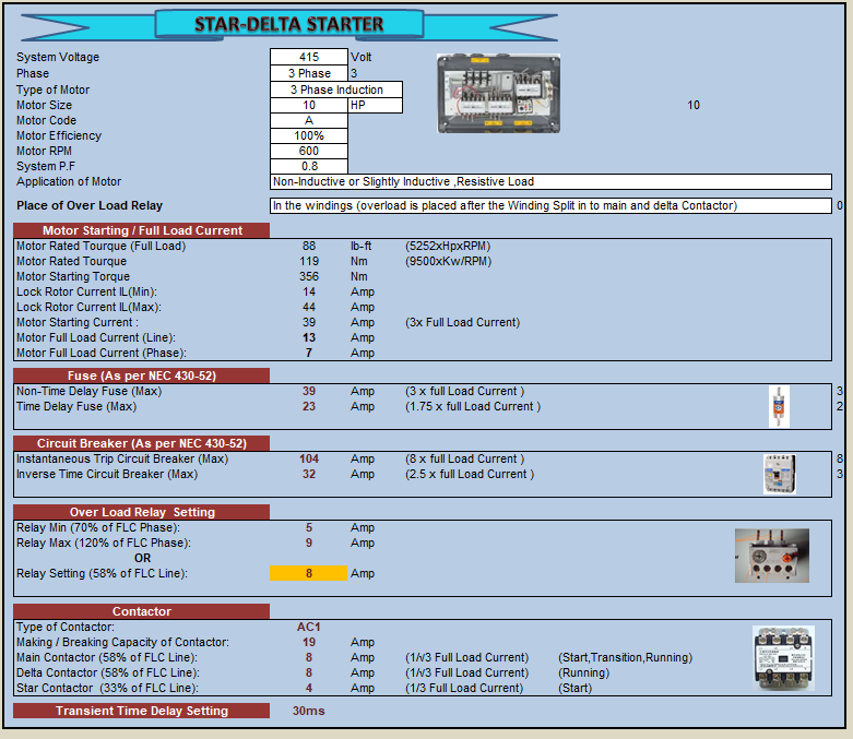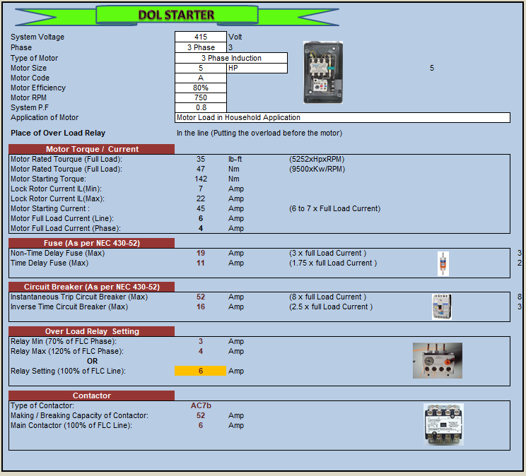 첨부 자료는 DOL, STAR-DELTA STARTER 사이징 시트 입니다.